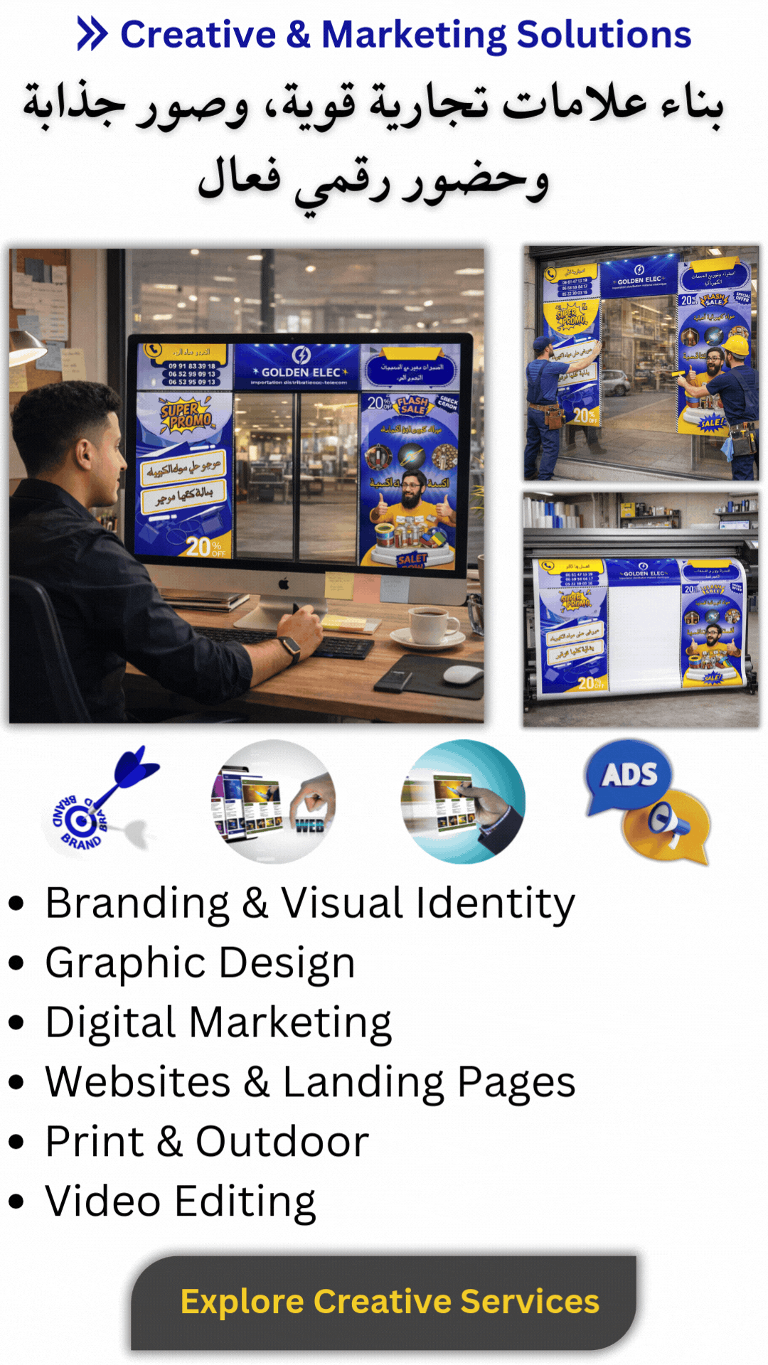 إلى جــانب ذلك، نعمل في مجال التصميم البصــري والحــلول التسويقية، حيث نحوّل الأفكار إلى أعمال واضحة، متناسقة، وقابلة للتنفيذ.